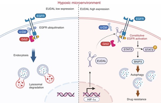 In normal conditions, EGFR is tagged by c-Cbl/Grb2 for breakdown inside lysosomes. In hypoxia, the RNA molecule EUDAL keeps EGFR permanently active. This activates the STAT3/BNIP3 pathway, triggering autophagy and allowing oral cancer cells to resist chemotherapy.