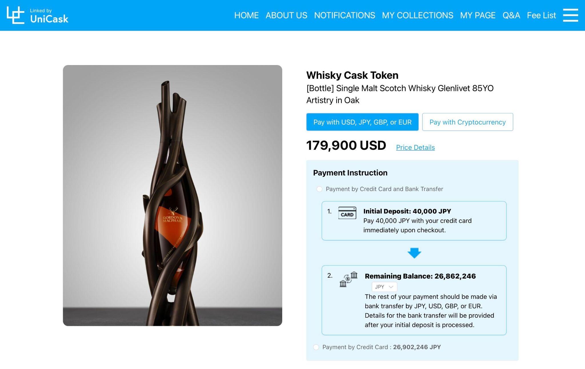 The first listing is the company’s masterpiece, “Glenlivet 85 Years Old – Artistry in Oak”, officially released on UniCask.